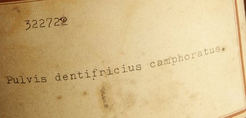 På mærkat "322722" og "Pulvis Dentifricius Camphoratus".