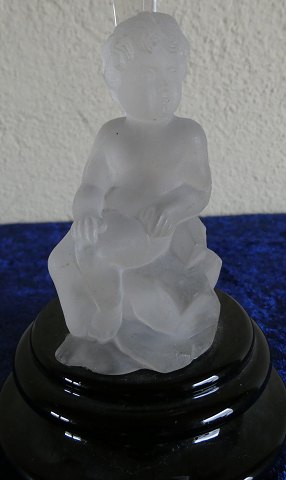 Visitkortskål på sort fod med figur af frossen glas i pæn stand. Figur: Siddende dreng på sten. H 13cm Skål Ø 10,5cm Lager: 1 Emne nummer: g-visitkortskål med figur