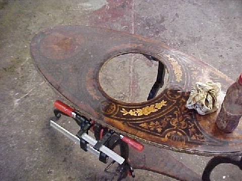 Afrensning af gammelt fernislag samt restaurering af fransk blomsterbord i empirestil ca. 1810. Læg specielt mærke til de smukke intarsiaindlægninger på bordpladen.