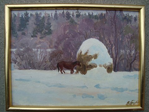 Text available in Danish: Maleri af russisk kunstner Vitaly Borovik - Vinterlandskab med hest 1992.
