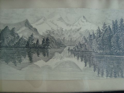 Tegning af Karl Nielsen 1956 "Bjergparti med sø".