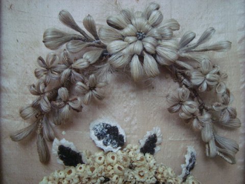 Stor buket lavet af hovedhår, samt en buket lavet af tørrede blomster - alt opsat på silke.