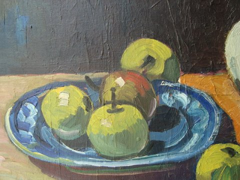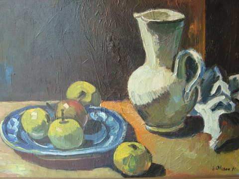 Maleri Eyvind Olesen 1941 - Opstilling med kande og frugtfad.