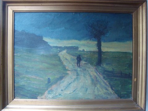 Text available in Danish: Maleri af ubekendt kunstner - Mand på vej - Søndergaards stil.