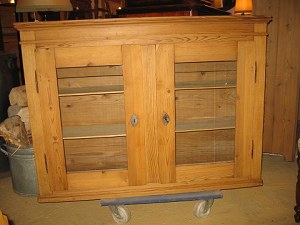 Vitrineskab afsyret fyrretræ med 2 låger Originalt skab Restaureret. mål B 116, H 85, D 29,cm. 6055/56/58-P Kan males efter eget ønske.