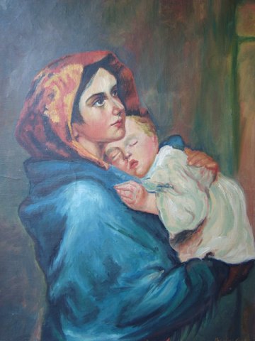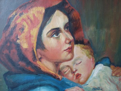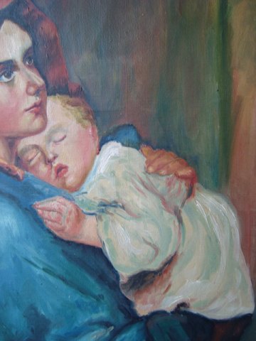 Text available in Danish: Maleri 1923 - kopi efter Roberto Ferruzzi's maleri "Gadernes Madonna" fra 1897.