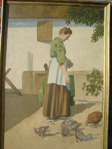 Gårdeksteriør med kone der fodre høns og ænder 1933.