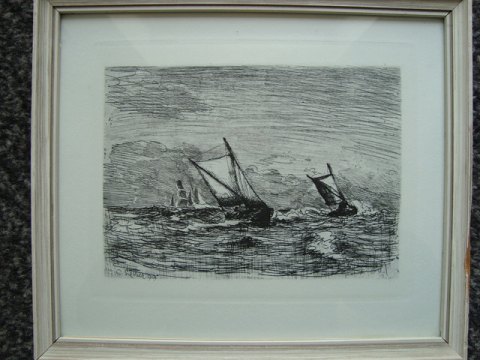 Radering af Carl Locher 1899 - Krydsende fiskerbåde ud for Skagen.
