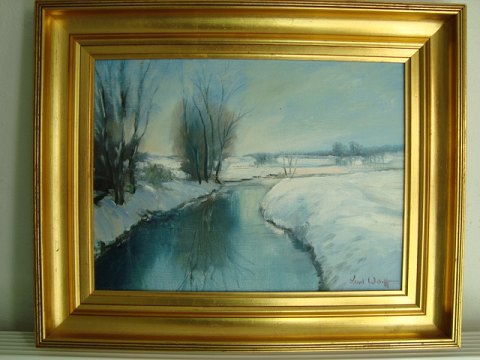Text available in Danish: Maleri af Karl Wolff - Vinterparti fra Køge å.