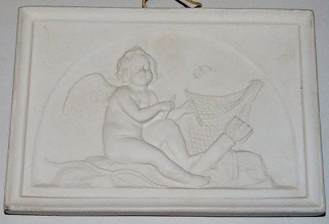 Bing & Grondahl Porcelæn Biscuit Platte "Amor Virker et Net" No 82. Kopi fra 1852 efter Thorvaldsens original fra Rom 1831. Måler 12,5 x 9,5cm (4.92 x 3.74 inch).