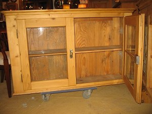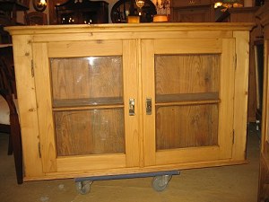 Vitrineskab afsyret fyrretræ med d glaslåger Originalt skab Restaureret . mål B 140, H 84, D 35,cm. 6358/59-P Kan males efter eget ønske.