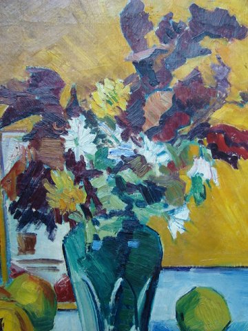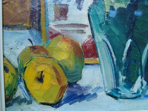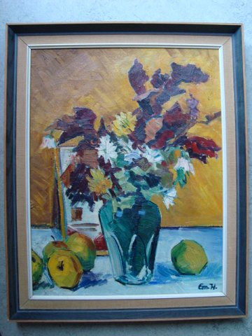 Maleri - Opstilling med blomster og frugt - Erik Mortensen 1971.