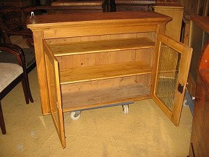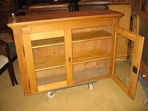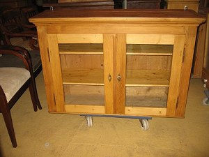 Vitrineskab afsyret fyrretræ med 2 glaslåger Originalt skab Restaureret . mål B 121, H 81, D 37,cm. 6495/98-P Kan males efter eget ønske.
