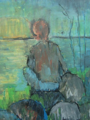 Gouache af Jørgen Wadmann 1962 - Dreng på stene ved solnedgang.