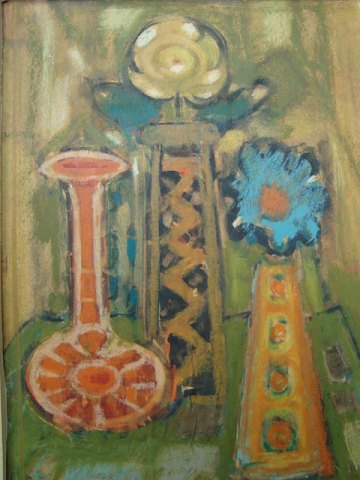 Pastel/oliekridt af Oscar Nicolaisen - vaser med blomster på bord 1965.