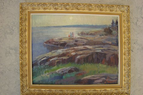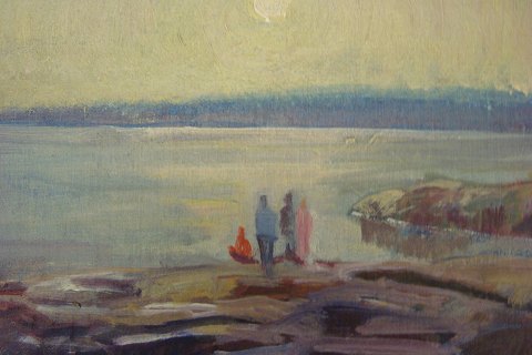 Maleri af Nis Stougaard - Klippeparti fra Bornholm med børn.