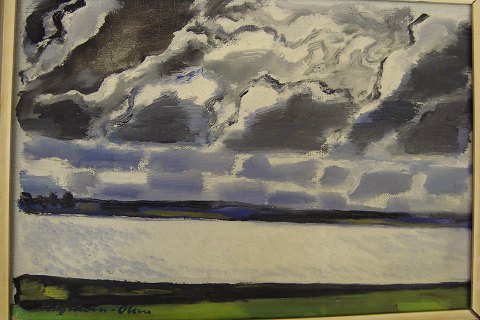 Text available in Danish: Maleri af Th. Hagedorn-Olsen - Grøn/blåt lanskab fra Roskilde Fjord.