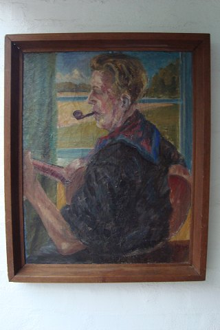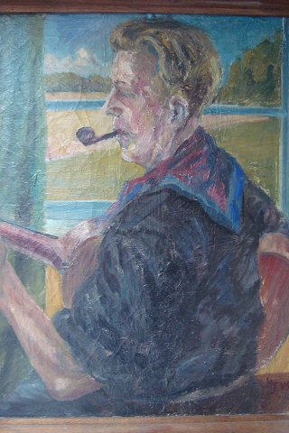 Text available in Danish: Maleri af Helge Jensen - Guitarspillende mand - Selvportræt? 1945.