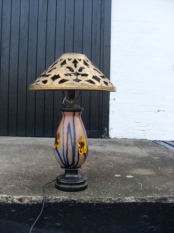 "Glasset" er dekoreret i med ule liljer og monteret på drejet træfod. Er monteret med ny ledning.
