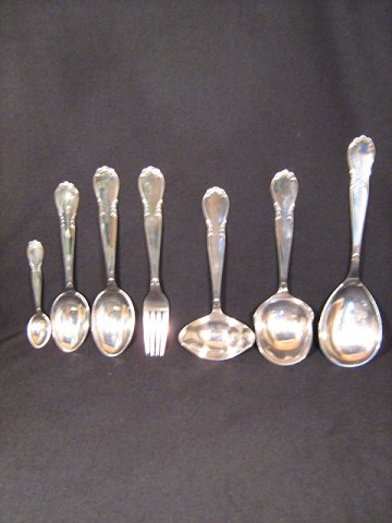 12 middags gafler, 12 middagsskeer, 12 frokostskeer, 12 teskeer, sovseske, kartoffelske, lille potageske.