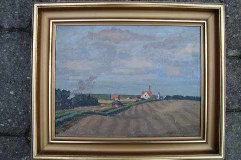 Text available in Danish: Maleri af Aage Lundgreen - landsby med mejeri i marklandskab.