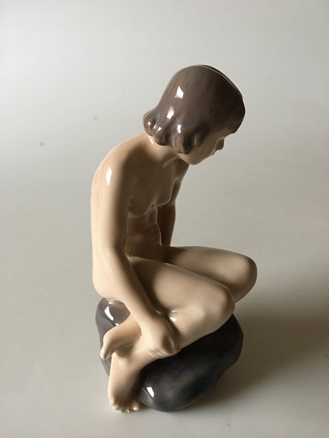 Royal Copenhagen Figur Pige på Sten No. 4027. Designet af Ada Bonfils. Måler 15 cm / 5,90 in. og er i god stand.