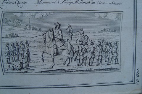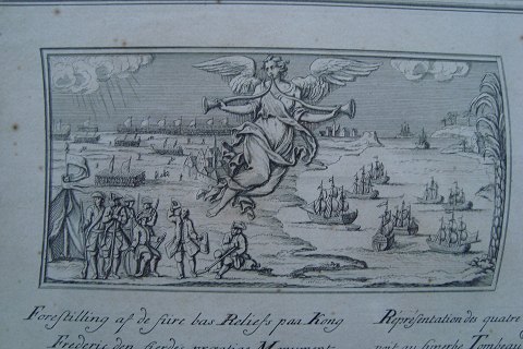 Tekst: Forestilling af de fiire bas Reliefs paa Kong Frederic den fierdes prægtige Monument. Og derefter det samme på fransk og tysk.
