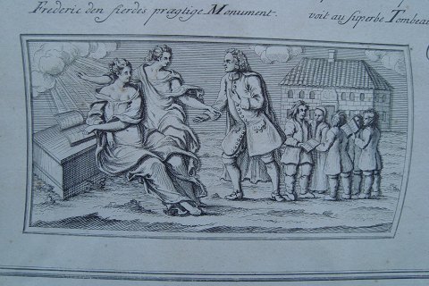 Kobbestik forestillende de 4 relieffer på HM Kong Frederik IV's sarkofag i Roskilde Domkirke fra Laurids de Thurahs "Den Danske Vitruvius" 1749 efter tegning af Johan Jacob Bruun (1715-89).
