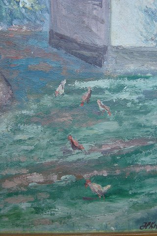 Text available in Danish: maleri af Hjalmar Kragh Pedersen - Gårdeksteriør med høns.