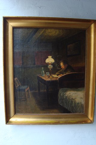 Læsende og rygende mand i interiør med petroleumslampe og øl.