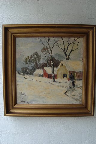 Maleri af Alex Andersen - Vinterlandskab med kvinde ved gård.