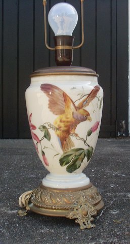 Smuk 1800 tals opaline lampe på messing fod, håndmalet dekoration med fugl, sommerfugl og blomster.