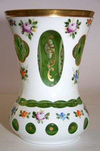 2 smukke Bøhmiske opalinevaser med indvendig grønt krystalglas, guldbort og guldstaferinger.