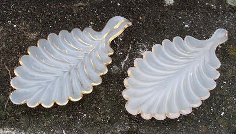 Par 1800tals bladformede fade i hvidt opalineglad med guld bemaling.