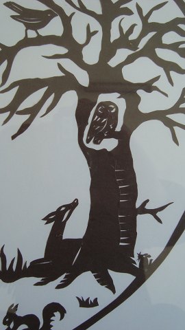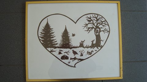 Hjerteform med diverse dyr i landskab bl.a. ugle.