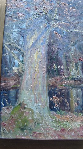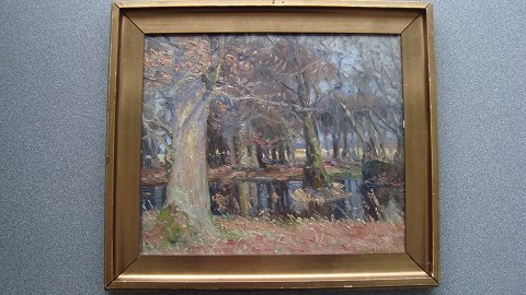 Bagpå gammel mærkat fra udstilling eller auktion med titlen "Ved det stille vand i Dyrehaven - Efteraar 1913.