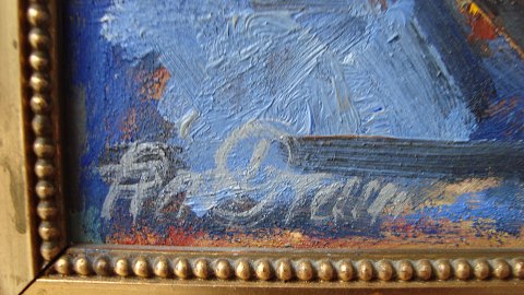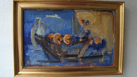 Maleri af Karl Gram - opstilling med krukker og frugtfad.