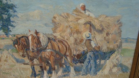 Høstscene med mand og kone ved hestevogn.