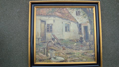 Gårdexteriør fra en gård i Aalborg med dreng og høns.