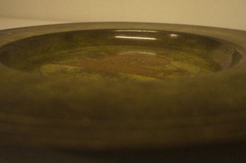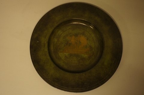 Stort "AMBI" ildfast bronce fad. 37 cm. i diameter. I god stand, lettere slidtage, lidt ridser. Motiv : Putti på sejlskib. Stemplet på bagsiden.