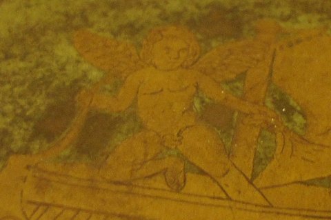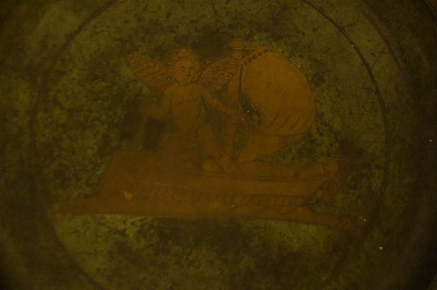 Stort "AMBI" ildfast bronce fad. 37 cm. i diameter. Motiv : Putti på sejlskib.