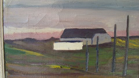 Maleri af Jens Bolander - Aftenstemning ved gård i vendsyssel.