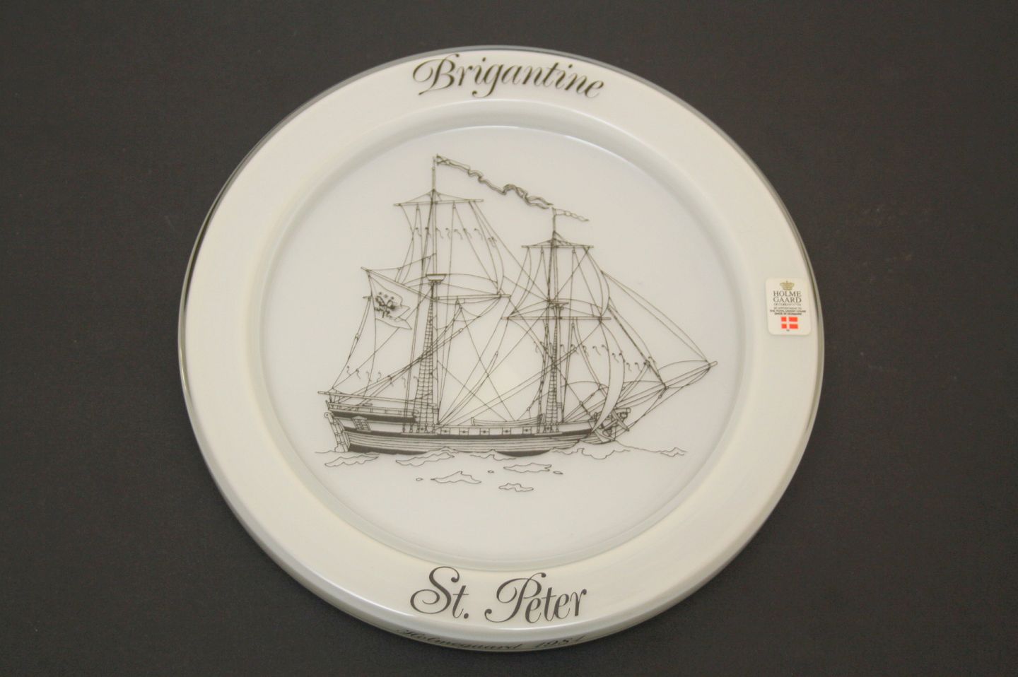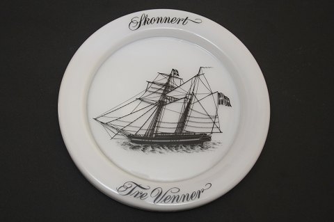 Holmegaard glasværk, Skibsplatter. Hvide glasplatter med sort tryk. Diameter 19,5 cm. Højde 2,5 cm. Designer Michael Bang, Dekoration Ole Winther,