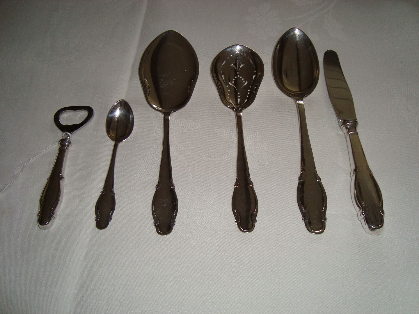 Frokostknive 1 stk. 20,5 cm. a. kr. 400 Middagsskeer 5 stk. 20,2 cm a. kr. 350. Dessertskeer 3 stk. 18 cm. a. kr. 300. Sukkerstrøske og kagespade a. kr. 450