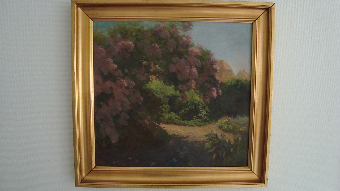 Haven på Høstvej 9, Charlottenlund med blomstrende syrener og villaen i baggrunden. Asmussen boede i mange år på Høstvej 9 i Charlottenlund.