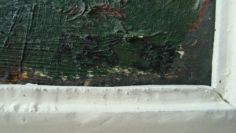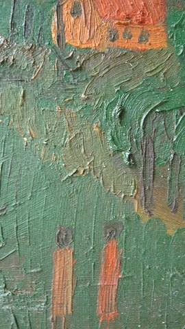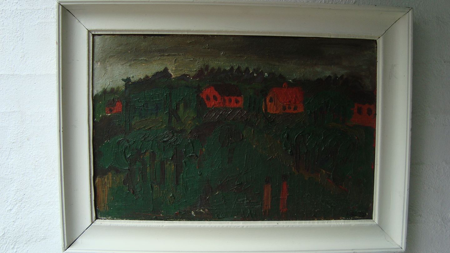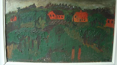 Maleri af Peder Brøndum Sørensen - Landskab med huse og personer 1958.
