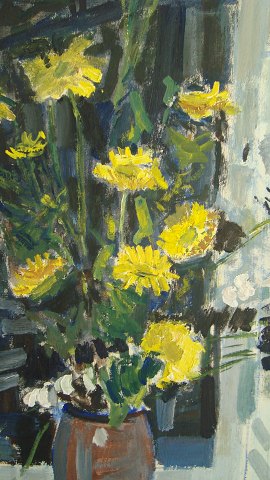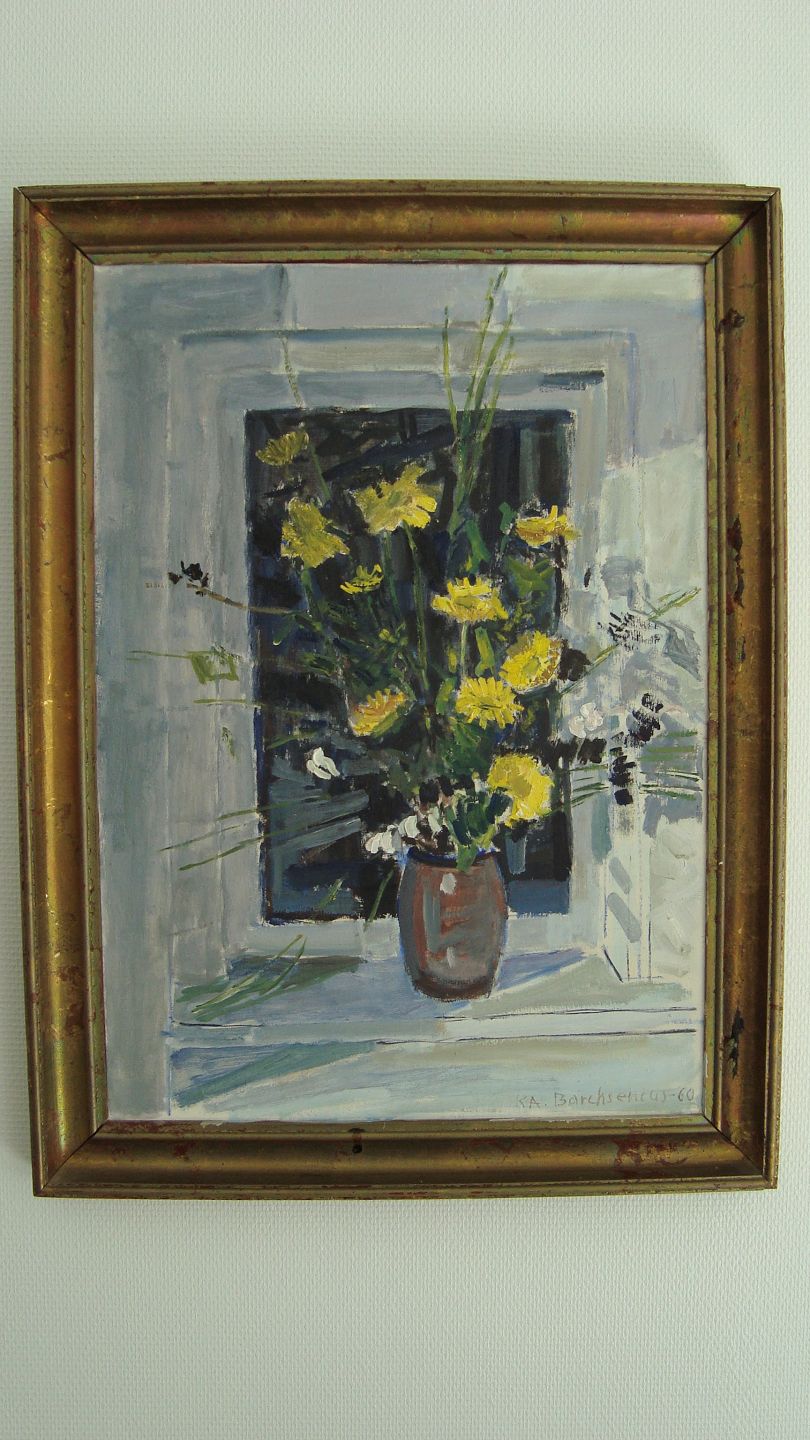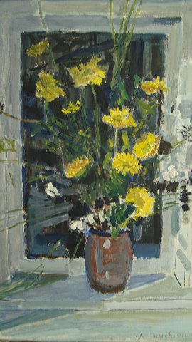 Maleri K.A. Borchsenius - Gule blomster i aftenlys 1960.