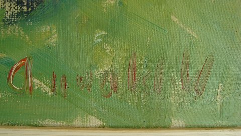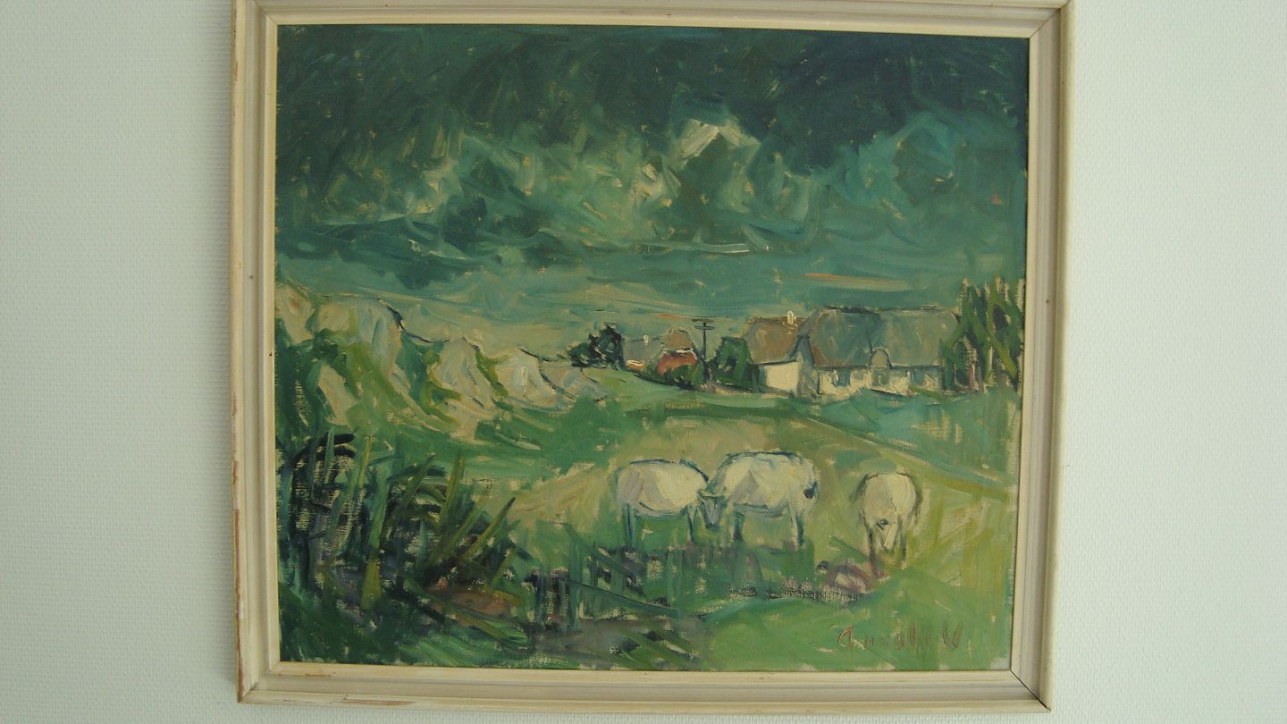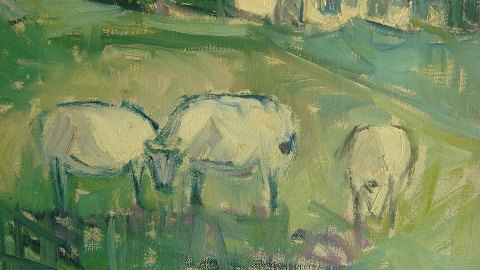 Maleri af Arnold W. Pedersen - Klitlandskab med huse og får.