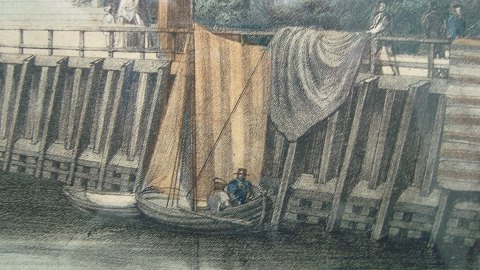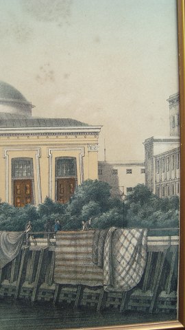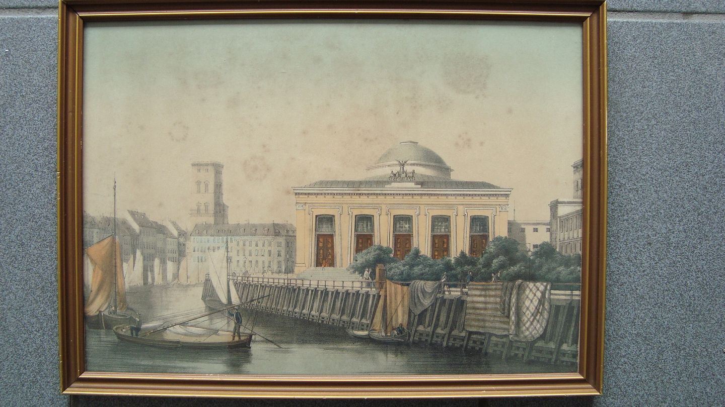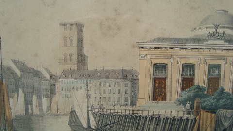 Koloreret litografi af Thorvaldsens Museum set fra Stormbroen.