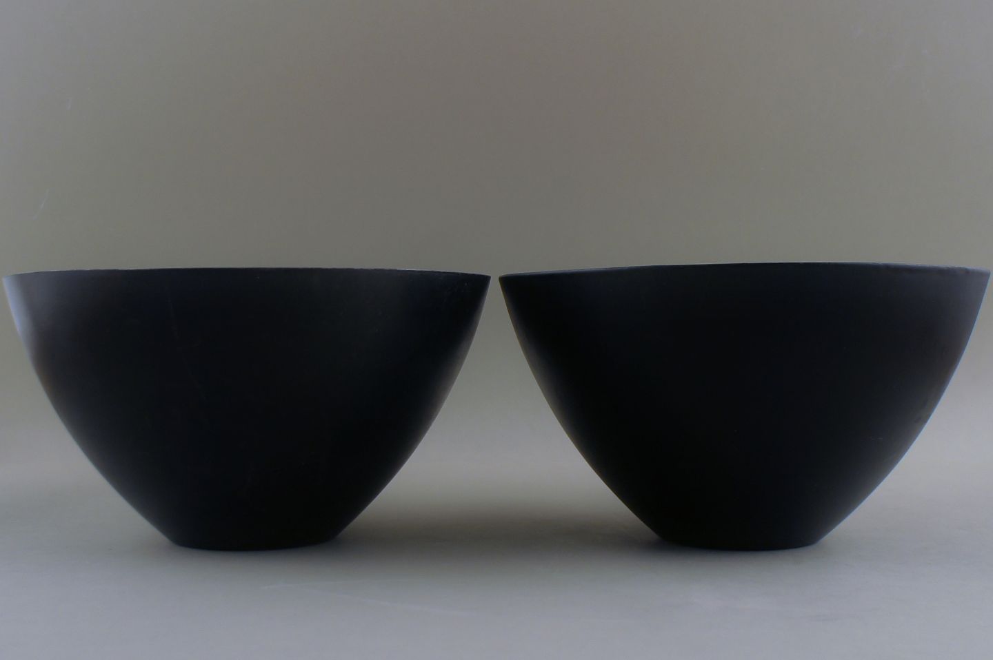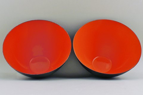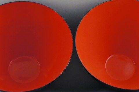 Her tilbydes en rød stor Krenit frugtskål af Herbert Krenchel. Sort metal og rød og orange emalje. 1970'erne.